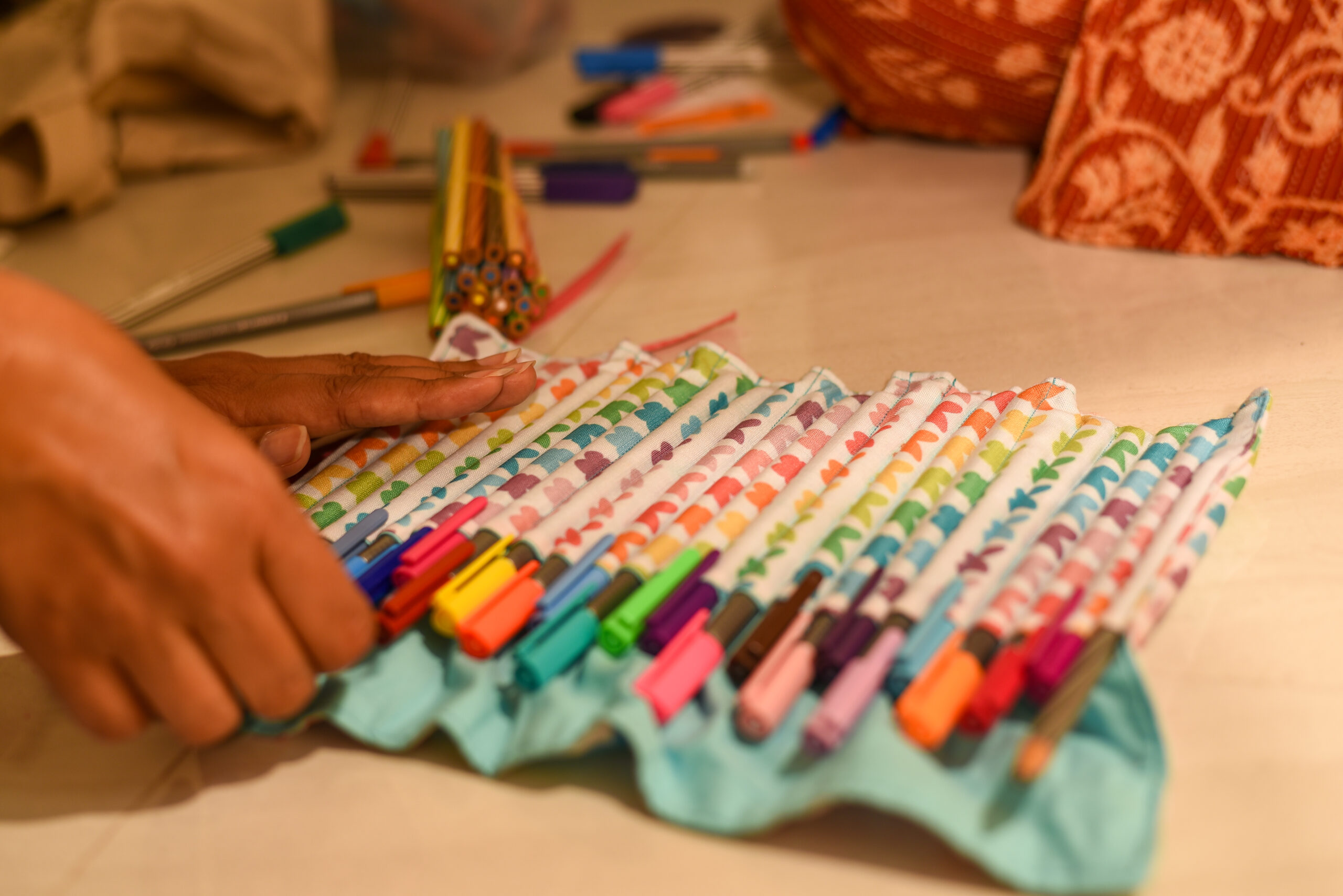 Fabric pencil roll-ups are handmade organizers designed to neatly store and carry colored pencils, crayons, or markers. Each roll-up is made from soft, durable cotton fabric, featuring individual stitched slots for each pencil to keep them securely in place. The roll-up design allows for easy storage, with a tie or elastic closure to keep it compact when rolled. It’s lightweight, portable, and perfect for kids, artists, or students on the go. These pencil roll-ups come in a variety of colorful, playful patterns and are washable, making them ideal for everyday use.
